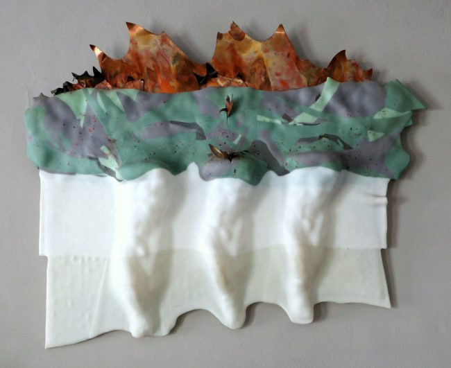 Glaciers melting across the Arctic, polar bears struggling to survive, extreme catastrophic fires raging in South America’s massive Amazon and up and down the American west coast threaten the very existence of multiple species…including us. Dimensions60.5” w x 53.5” h MediumAcrylic, colláge, with natural branches and gold leaf.