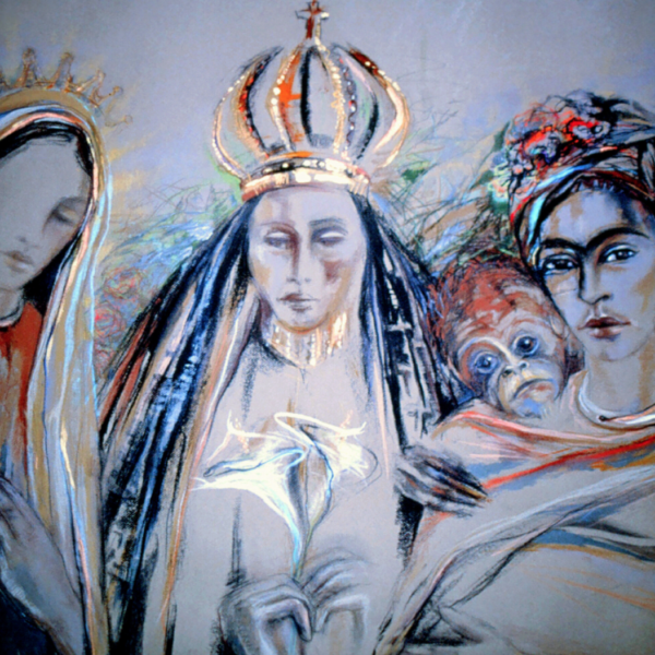 In her drawing “Las Tres Mujeres” Glazière honors the sacred feminine of Mexico culture with Our Lady of Guadalupe, Patroness of Mexico, and Virgen de Soledad, Patron Saint of Oaxaca with the uncompromising 20th century Mexican artist Frida Kahlo. Glacière was inspired to create the large drawing after featuring the three ladies in a mural she painted in Oaxaca, Mexico.