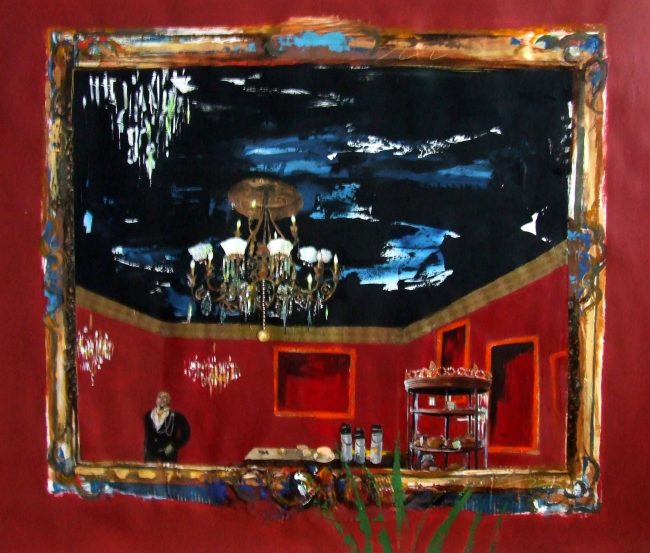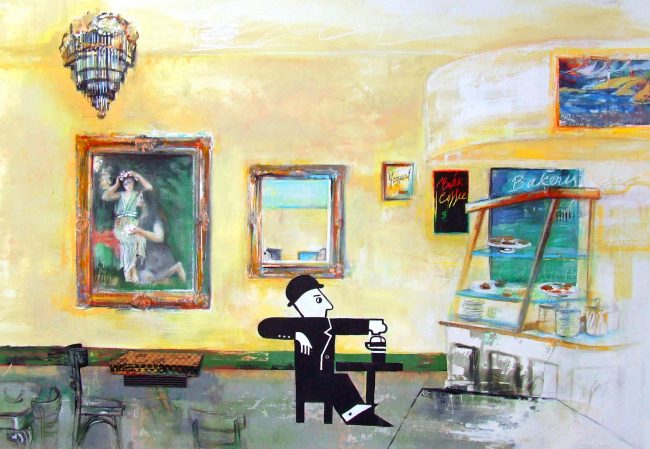 My painting is of Starbuck’s Flagship store at the Pike Place Market in Seattle. The original coffeehouse paintings are an assembláge of acrylic paint, charcoal, pastel, colored pencil and colláge. Dimensions51″w x 41″h MediumMixed media on paper