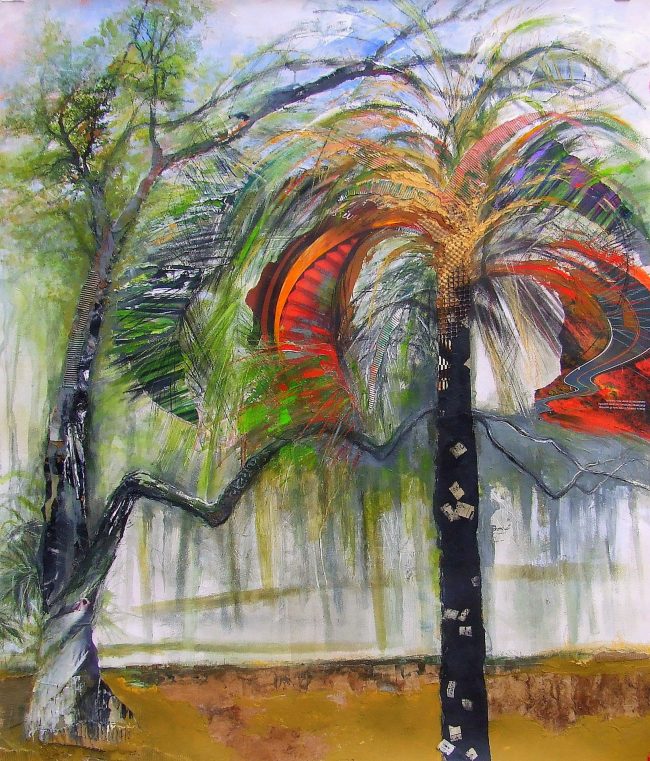 Life on earth is in a precarious state. The world seems to be discharging so many climatic and human tragedies and there seems to be no letting up. Gradually an idea for a painting began to germinate. I knew what the title would be before I made a single mark on the canvas—Quake. Dimensions 54″w…
